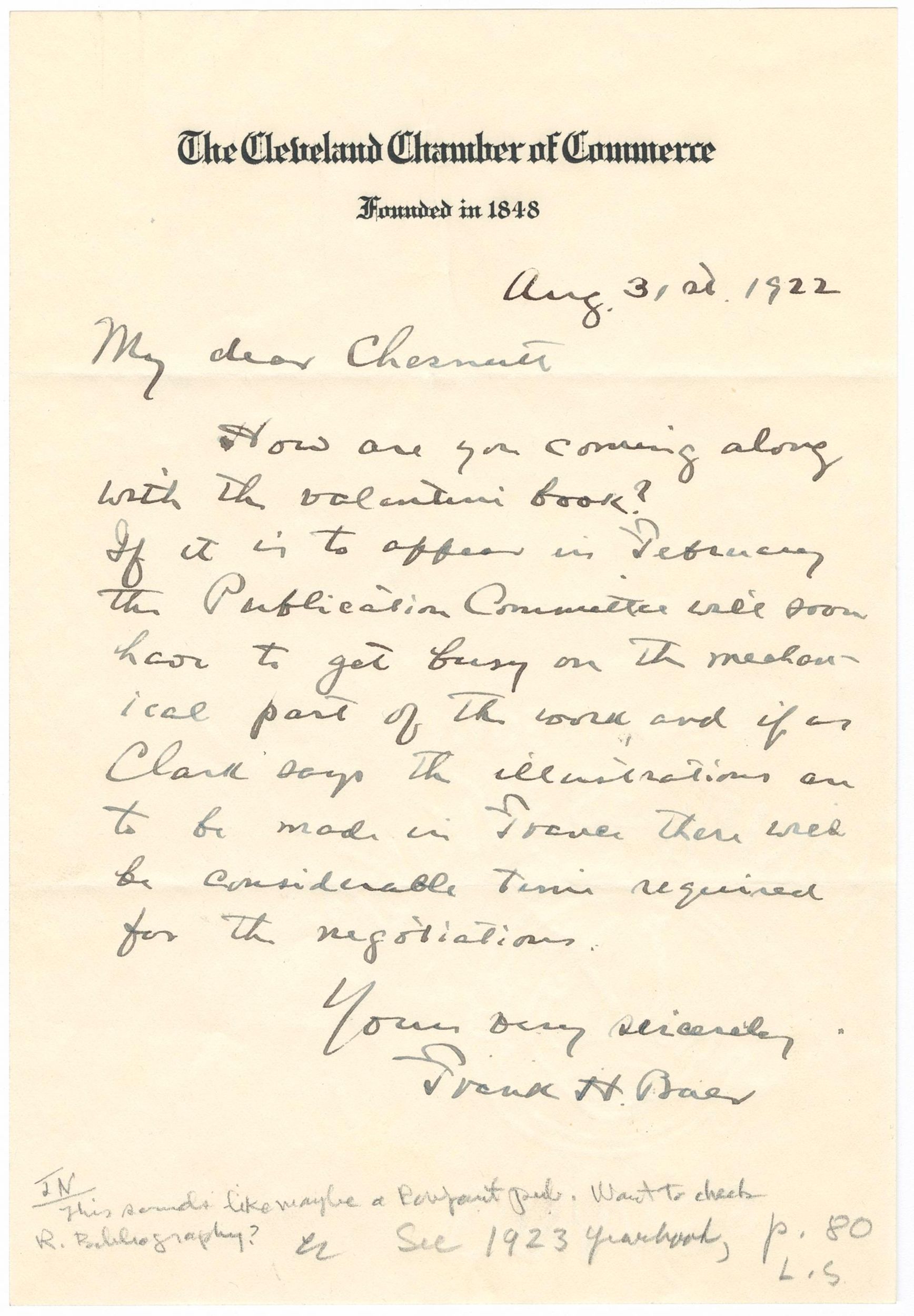 Correspondent: Frank House Baer (1863–1940) was a White Clevelander. He was an agent for the Nickel Plate Road (New York, Chicago & St. Louis Railroad) railway company and then served on the Chamber of Commerce as transportation commissioner (1918–1937). Like Chesnutt, he was a member of the Rowfant Club. An avid book collector, he was known for his collection of over two thousand valentines written between 1720 and 1870. Portions were exhibited locally (and sometimes nationally) from the late 1890s into the 1920s. A joint book project with Chesnutt on the collection was apparently launched in 1922 but abandoned after 1924.