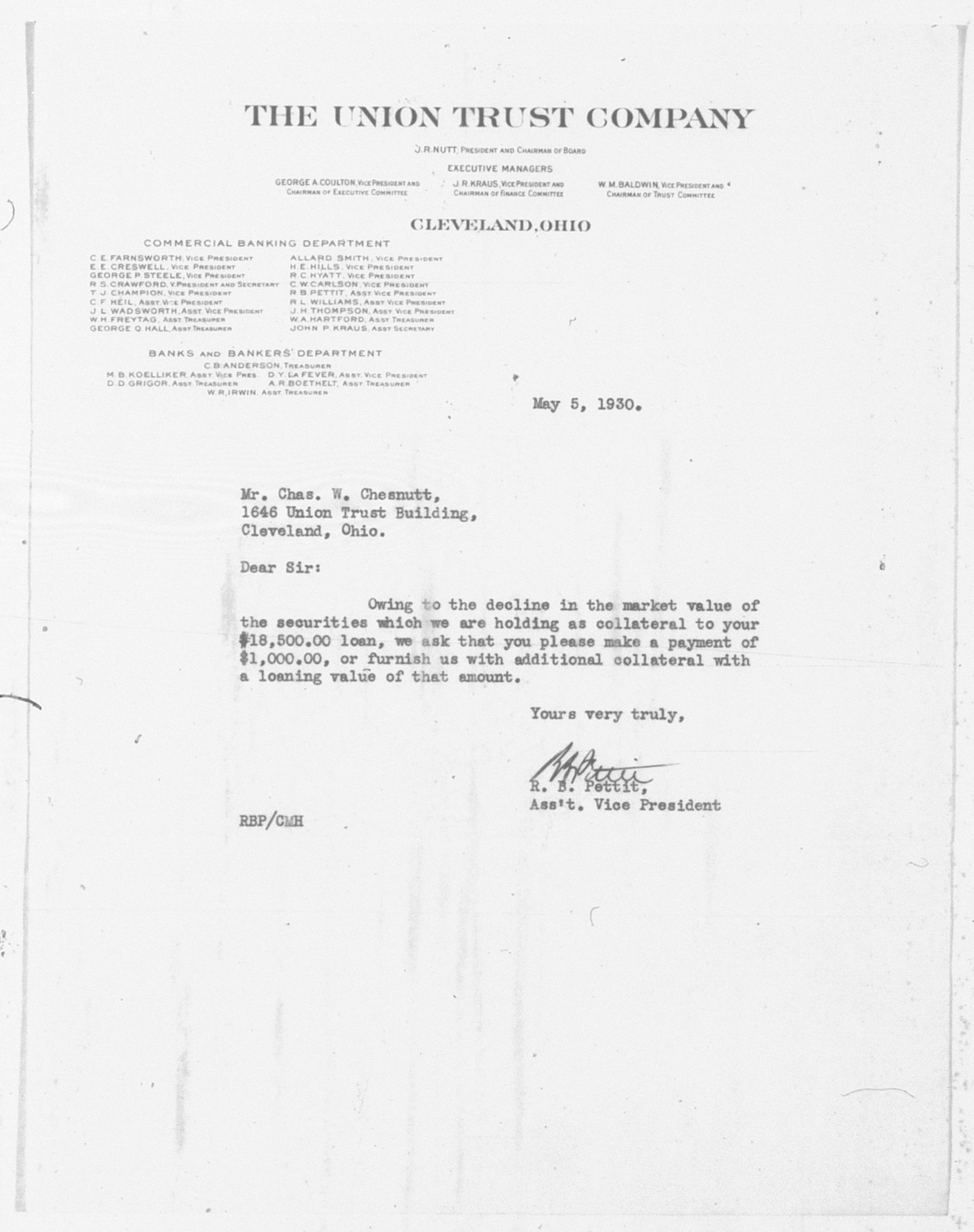 Yours very truly, R. B. Pettit R. B. Pettit, Ass't. Vice President. RBP/CMHCorrespondent: Ralph Bowman Pettit (1879–1954) was a White banker from Ohio who started as a bank accountant and teller in his early 20s and rose high in the ranks of Union Trust Bank after its founding in 1920. He worked primarily for the collateral loan department and was consecutively assistant vice president, vice president, and eventually treasurer of Union Trust, which is the position he held when the bank was closed after the bank collapse of 1933.