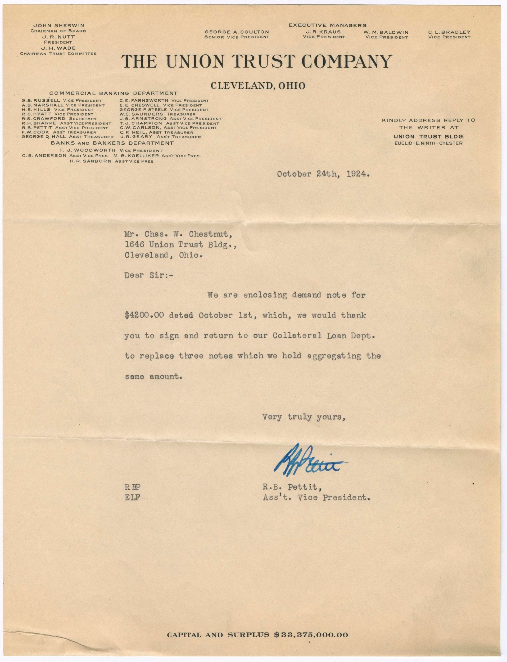 Very truly yours, R. B. Pettit R. B. Pettit, Ass't. Vice President. RBP ELFCorrespondent: Ralph Bowman Pettit (1879–1954) was a White banker from Ohio who started as a bank accountant and teller in his early 20s and rose high in the ranks of Union Trust Bank after its founding in 1920. He worked primarily for the collateral loan department and was consecutively assistant vice president, vice president, and eventually treasurer of Union Trust, which is the position he held when the bank was closed after the bank collapse of 1933.