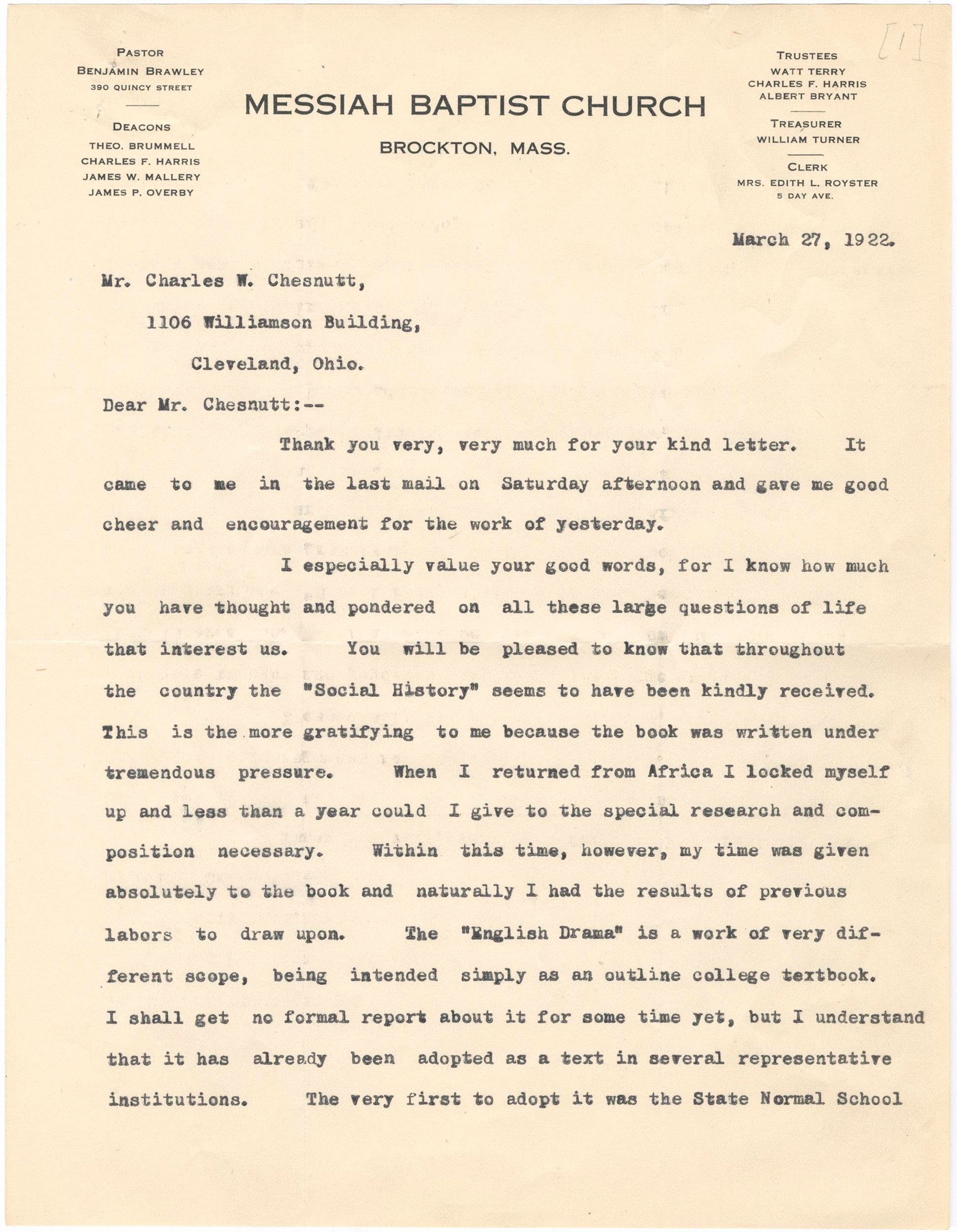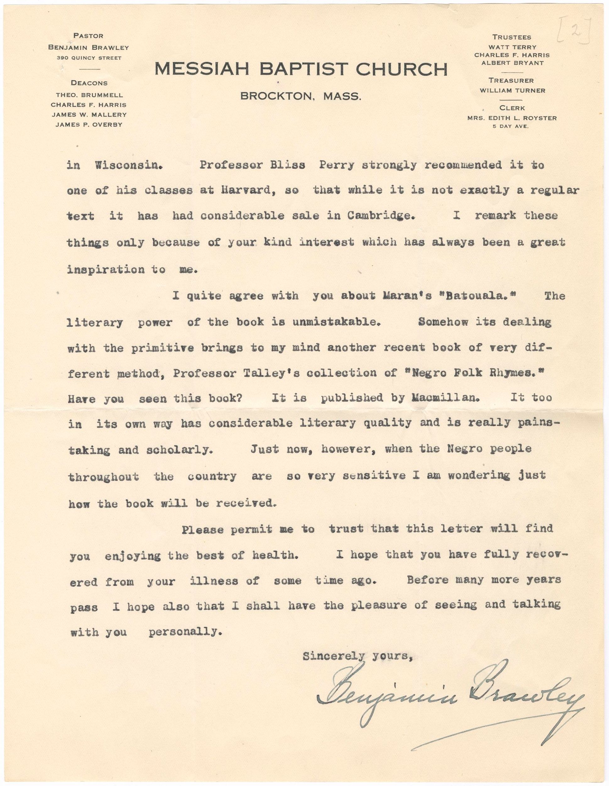 Sincerely yours, Benjamin BrawleyCorrespondent: Benjamin Griffith Brawley (1882–1939) was a Black writer, teacher, and clergyman from South Carolina, whose first college degree from Atlanta Baptist College (now Morehouse College) in 1901 was followed by degrees from the University of Chicago and Harvard. He taught at several historically Black colleges and universities, serving as dean at Morehouse College (1912–1920) and as chair of the English department at Howard University (1937–1939). He wrote poetry as well as many scholarly articles and books on Black history and literature, starting with A Short History of the American Negro (New York: Macmillan, 1913).