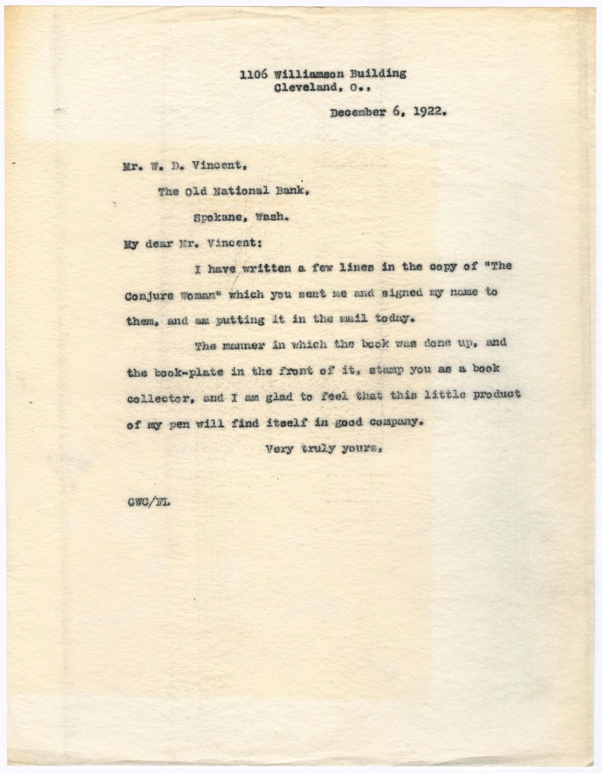 Very truly yours, CWC/FLCorrespondent: William D. Vincent (1866–1935) was a White banker in Spokane, Washington, who was president of Old National Bank of Spokane (1920–1933). He was an amateur historian of the American Northwest and a collector of rare books and bookplates.