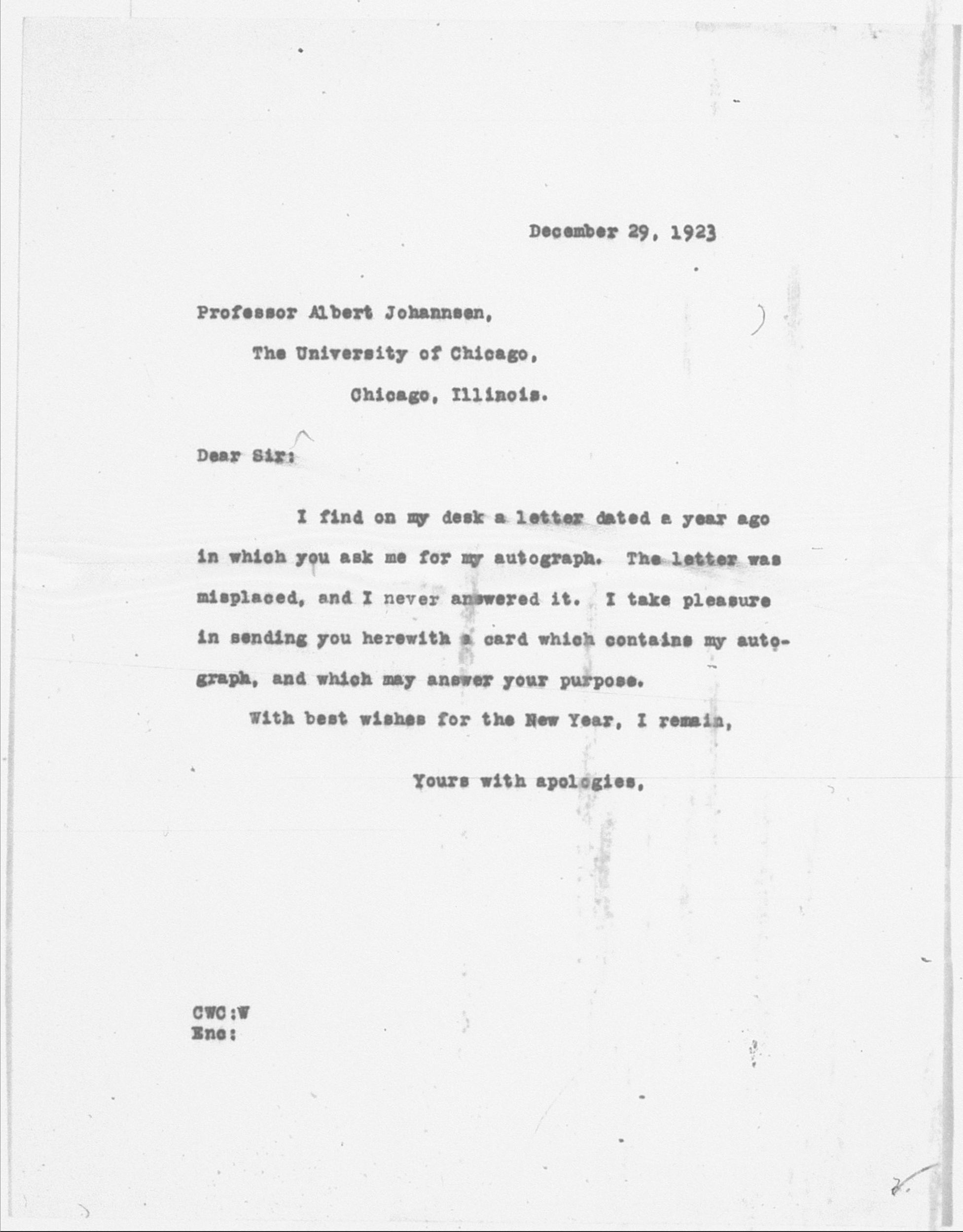 Yours with apologies, CWC:WCorrespondent: Albert Johannsen (1871–1962) was a White Iowa-born geologist who specialized in microscopal petrography. He worked for the U.S. Geological Survey (1903–1925) and taught at the University of Chicago (1909–1937). He was also a photographer, collected autographs, dime novels, and first editions of Charles Dickens, and, after his retirement, published a multi-volume guide to dime novels and a book on an early Dickens illustrator.