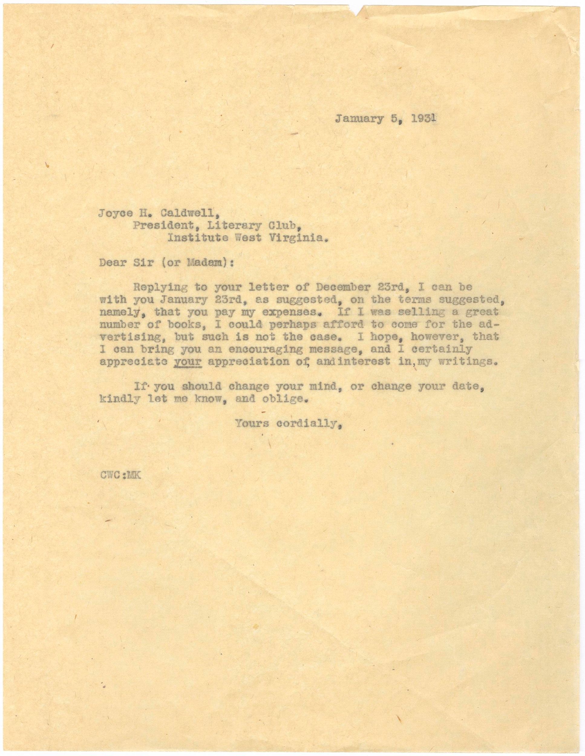 Yours cordially, CWC: MKCorrespondent: Joyce H. Caldwell (b. 1910), the student president of the Literary Club at West Virginia State College (later University), graduated in May of 1931 and returned to her home state of North Carolina to become a schoolteacher.