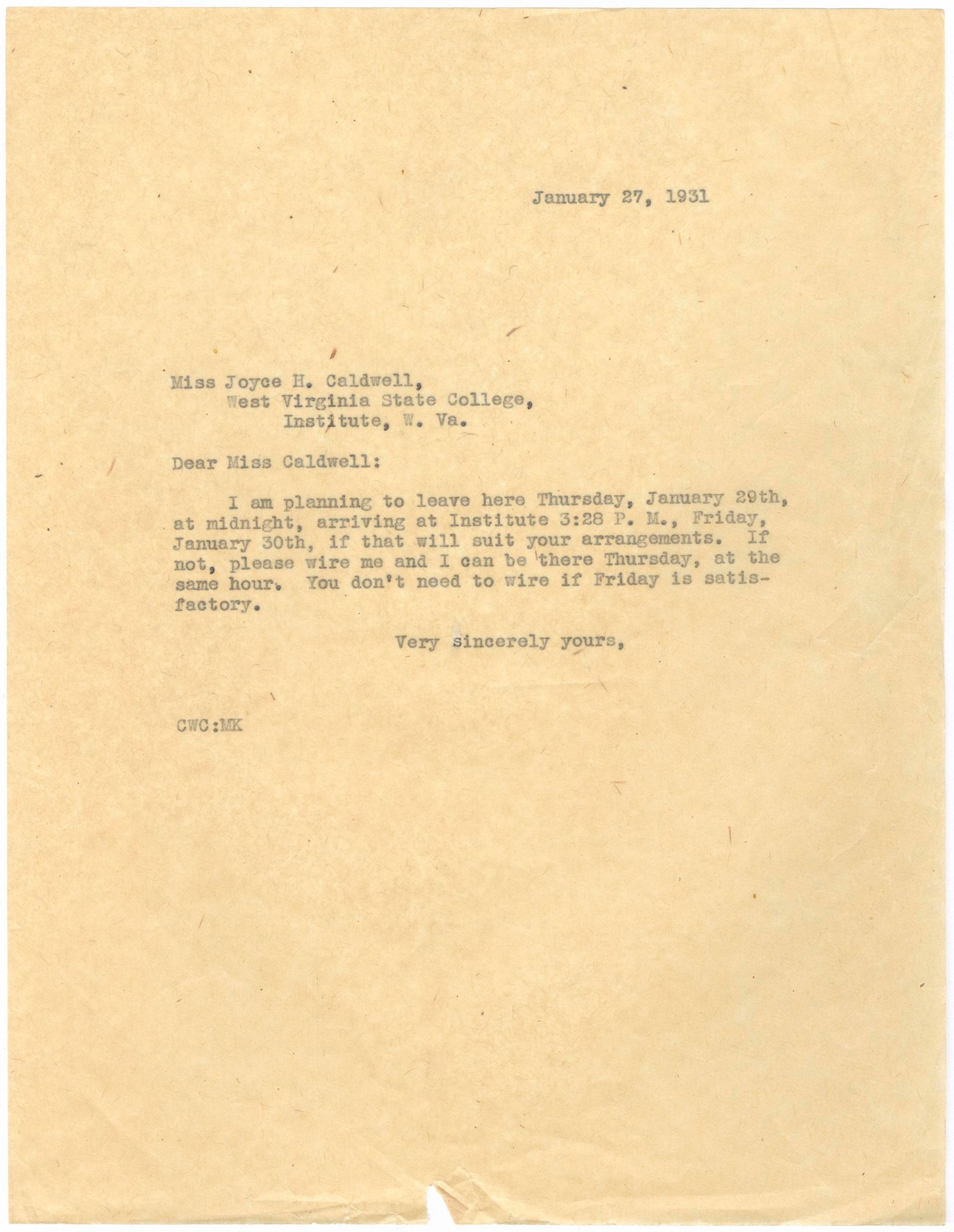 Very sincerely yours, CWC:MKCorrespondent: Joyce H. Caldwell (b. 1910), the student president of the Literary Club at West Virginia State College (later University), graduated in May of 1931 and returned to her home state of North Carolina to become a schoolteacher.
