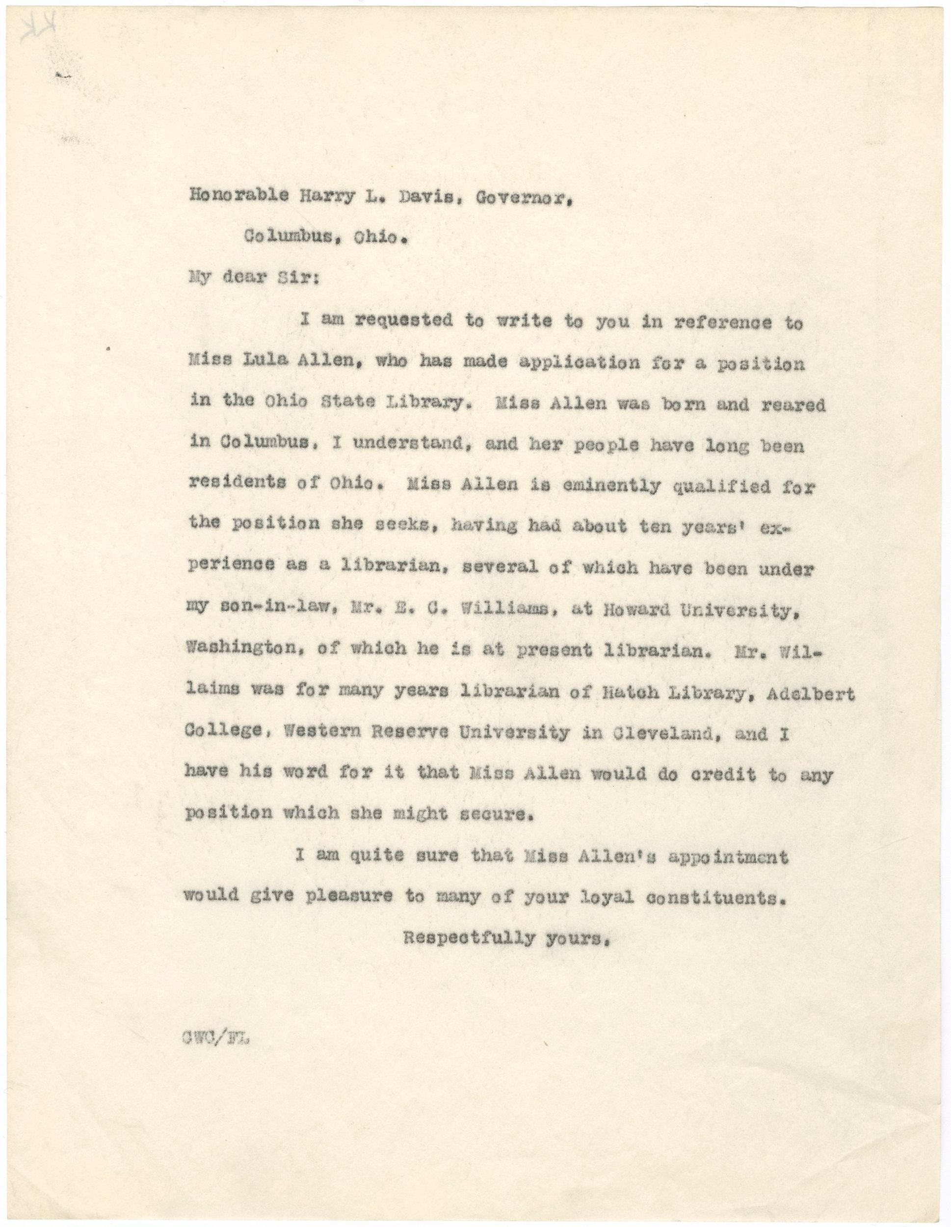 I am requested to write to you in reference to Miss Lula Allen,2 who has made application for a position in the Ohio State Library.3 Miss Allen was born and reared in Columbus, I understand, and her people have long been residents of Ohio. Miss Allen is eminently qualified for the position she seeks, having had about ten years' experience as a librarian, several of which have been under my son-in-law, Mr. E. C. Williams,4 at Howard University, Washington, of which he is at present librarian.5 Mr. Williams was for many years librarian of Hatch Library, Adelbert College, Western Reserve University in Cleveland,6 and I have his word for it that Miss Allen would do credit to any position which she might secure.