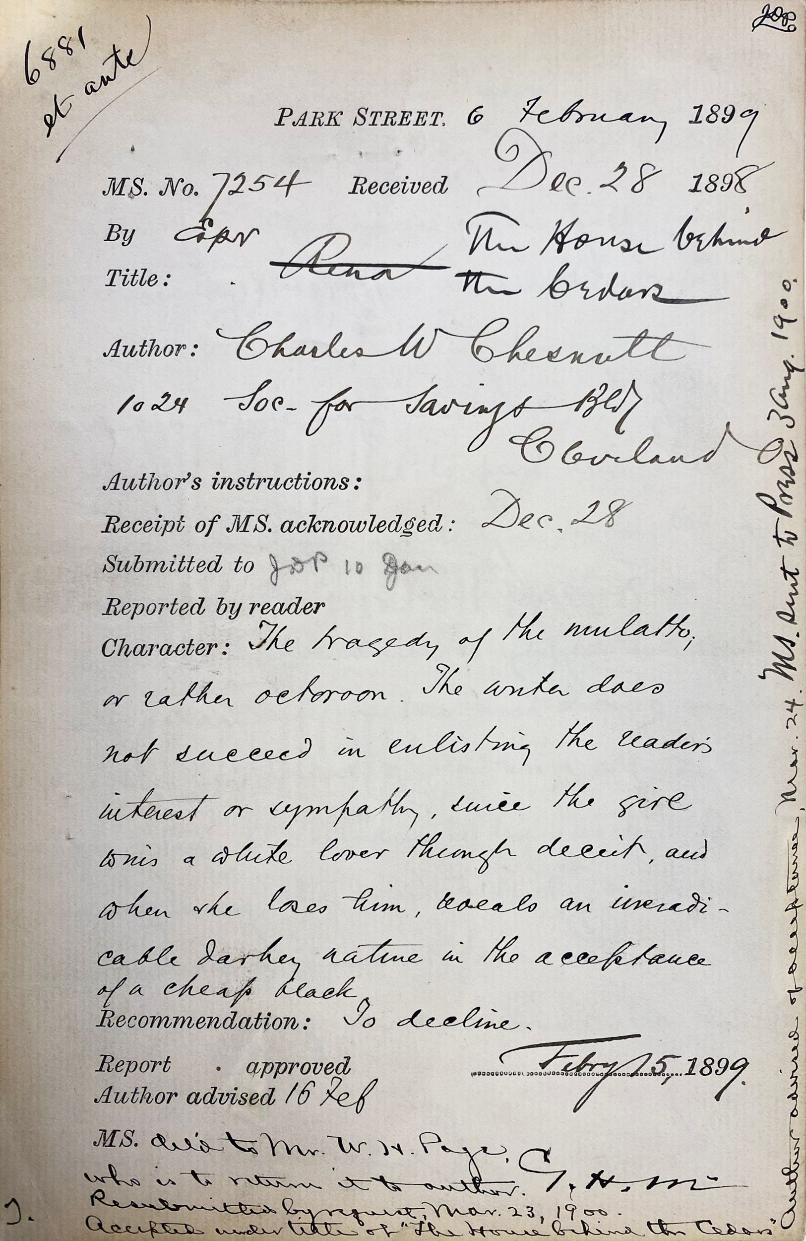 December 28, 1898–August 3, 1900, Houghton Library, Harvard University, Houghton Mifflin Company reader reports on manuscripts submitted for publication, MS Am 2516 (7254).