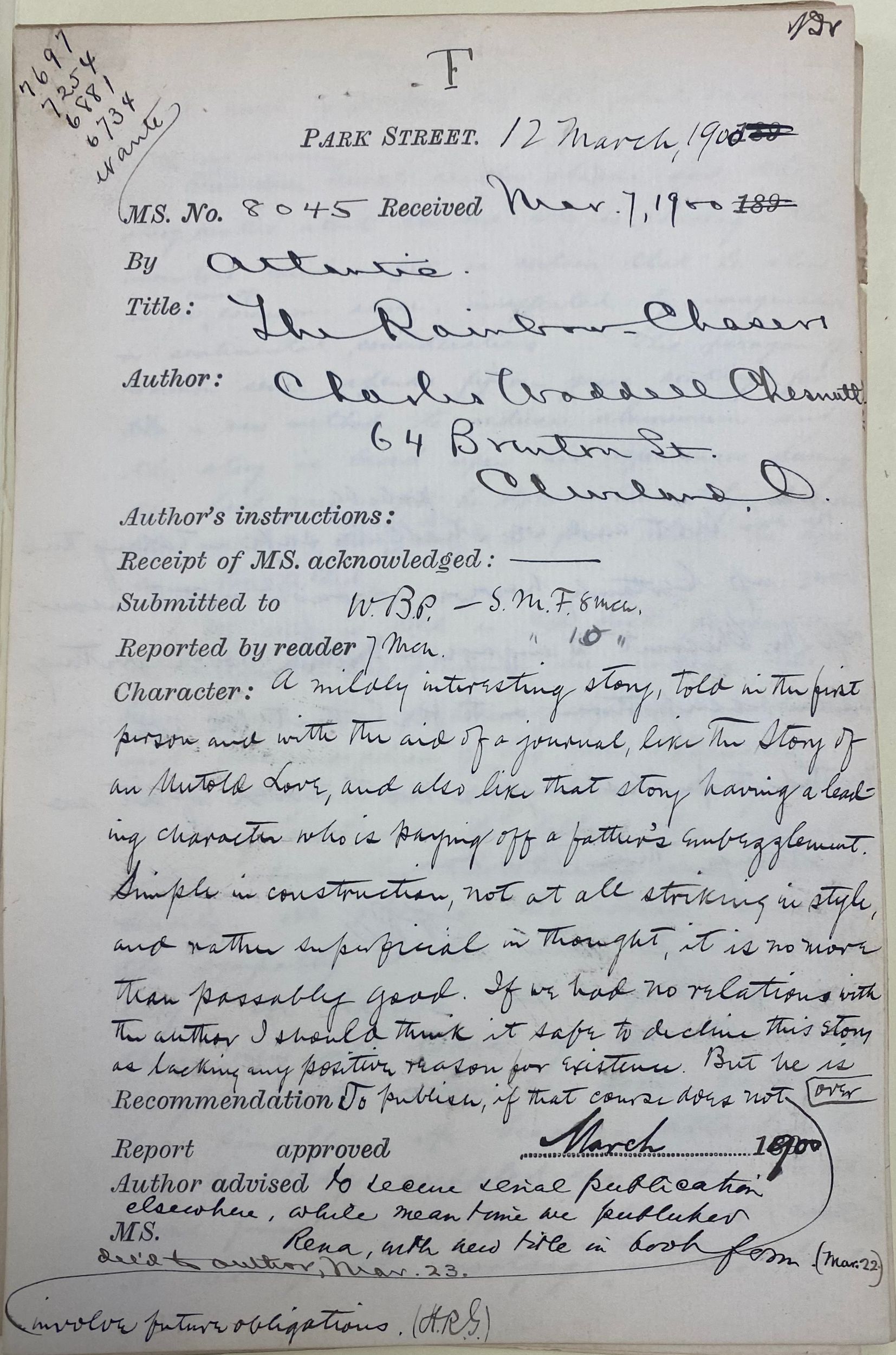 March 7, 1900–March 23, 1900, Houghton Library, Harvard University, Houghton Mifflin Company reader reports on manuscripts submitted for publication, MS Am 2516 (8045).