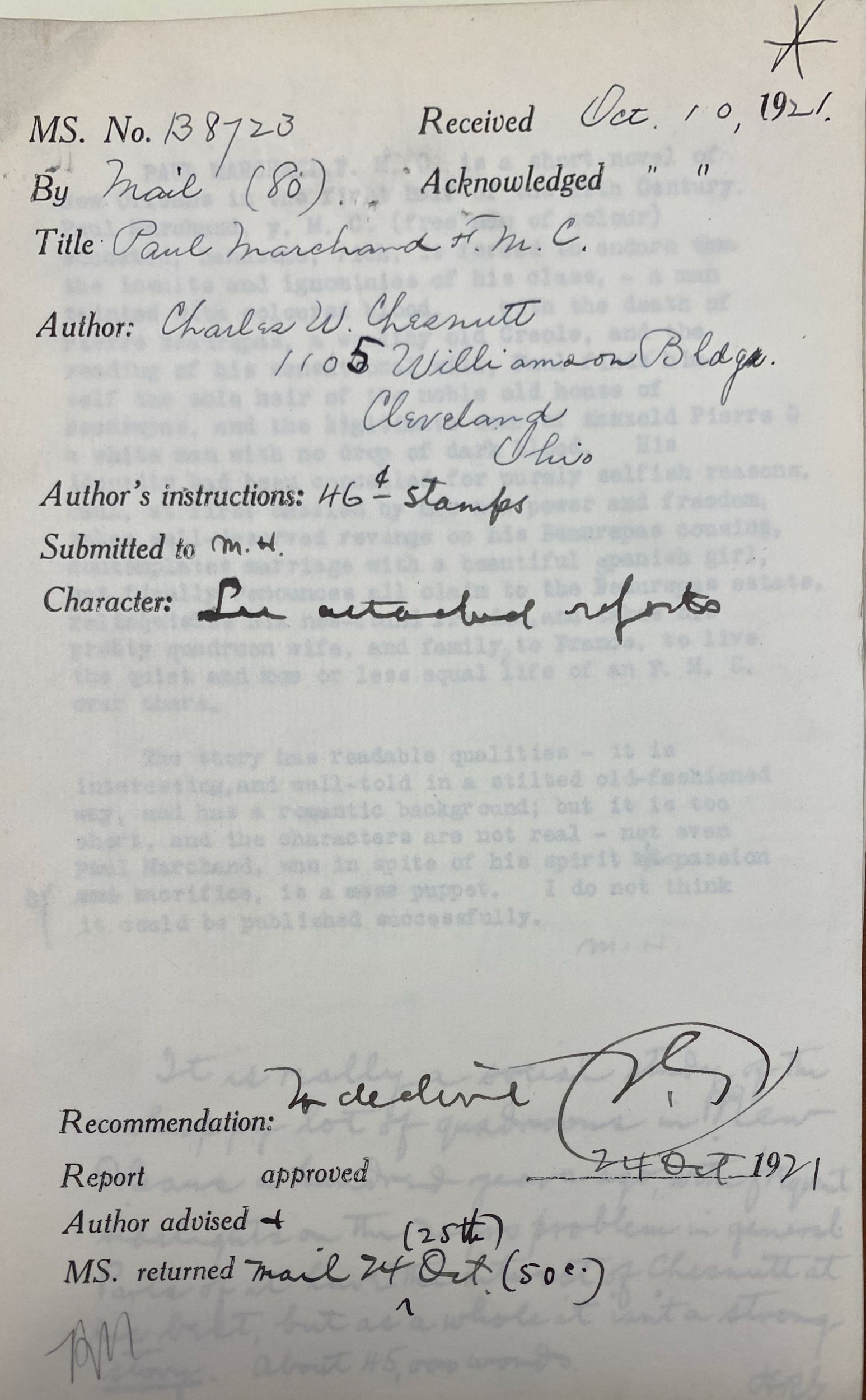 October 10, 1921–October 24, 1921, Houghton Library, Harvard University, Houghton Mifflin Company reader reports on manuscripts submitted for publication, MS Am 2516 (B8720).